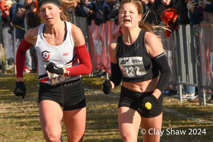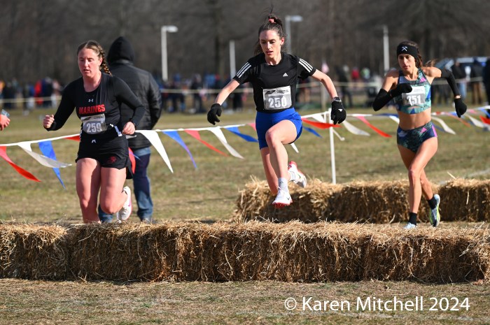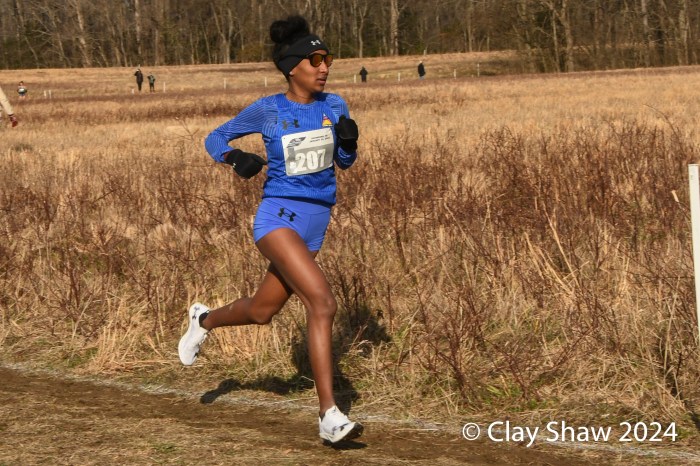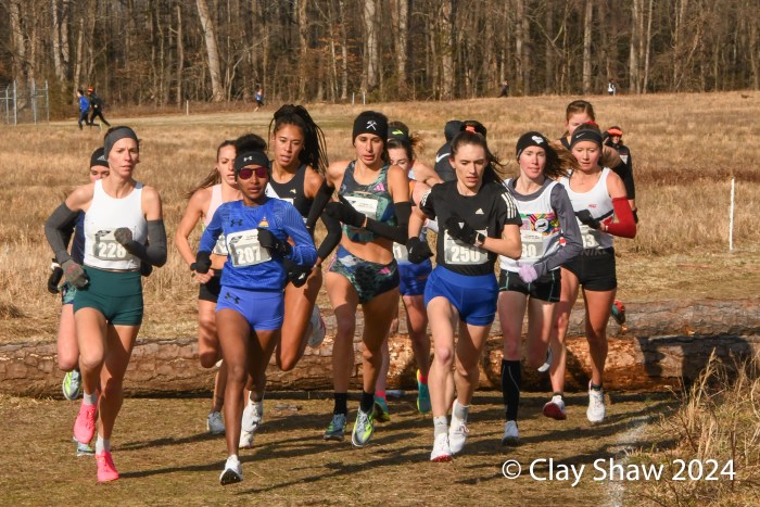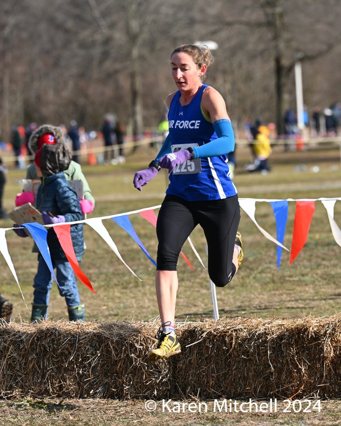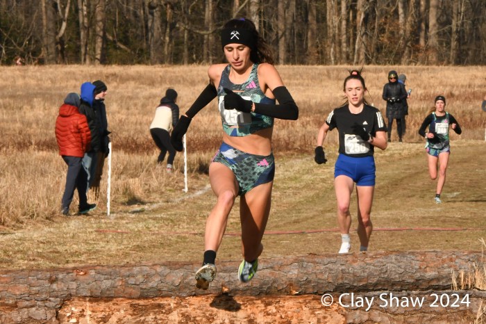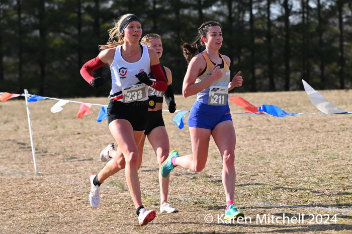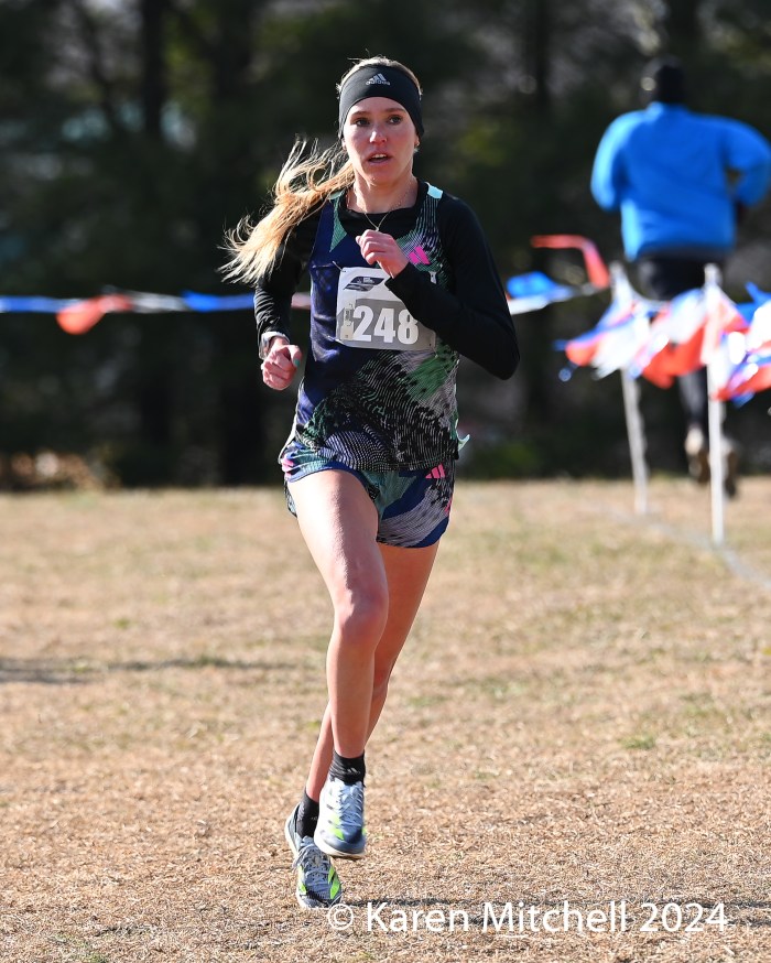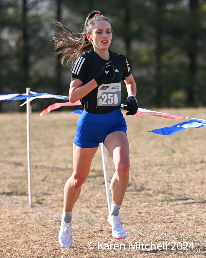 49 open women finished the 10K, held at Pole Green Park in Mechanicsville, Virginia, just northeast of Richmond. This year’s course featured a set of hay bales and two sets of logs to negotiate. Unlike the mild weather of 2023, the 2024 meet temps were under the freezing mark with brisk winds for the entire day.