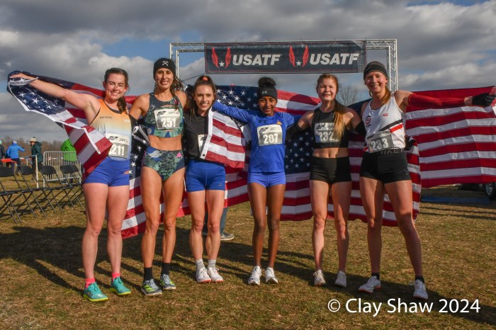 Happy USA Open Women 10K top six, earning a spot on Team USA going to World Cross Country in Belgrade, Serbia on March 30. From left to right are: Abby Nichols, Katie Camarena, Emma Grace Hurley, Weini Kelati, Allie Ostrander and Cailie Logue.