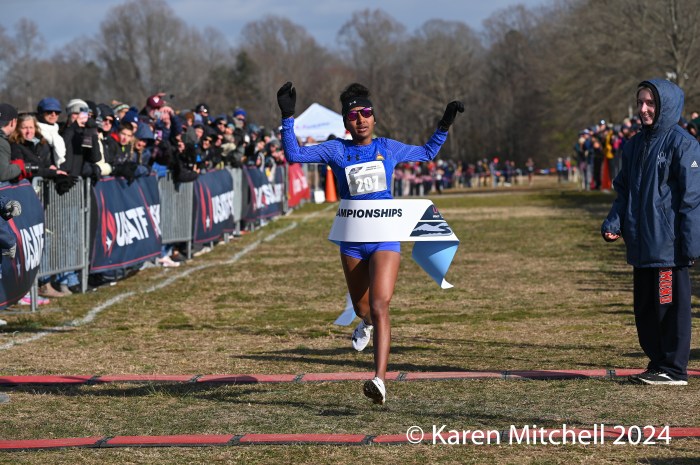 January 20, 2024, Mechanicsville, VA, 2024 USATF National Cross Country Championships—Weini Kelati of Flagstaff, AZ set a new USA half marathon record of 1:06:25 in Houston, TX just six days prior to the Cross Country Championships. Despite presumably tired legs from the half marathon and an illness in the days between the two events, she simply dominated the competition here winning the cross country 10K race by 37 seconds in 32:59. Kelati ran with a large pack through the first two of the five two-kilometer loops in Pole Green Park before she broke away. She became the first woman to win Foot Locker, NCAA, and USA cross country titles.