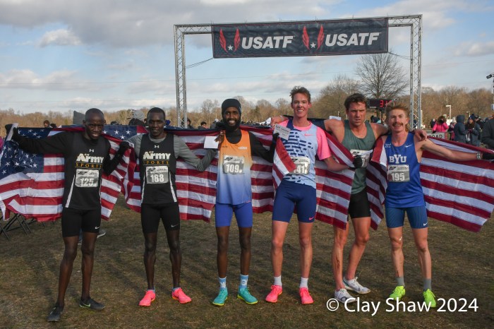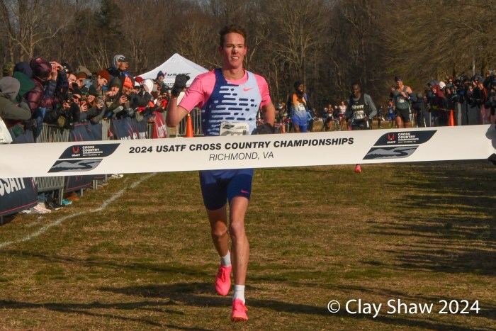 January 20, 2024, Mechanicsville, VA, 2024 USATF Cross Country Championships—Cooper Teare, known more for 1500-meter through 5000-meter prowess, used his speed to power to victory in 29:07.