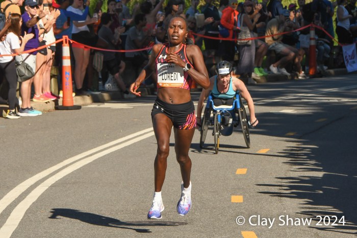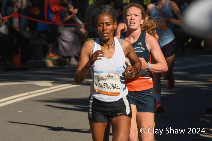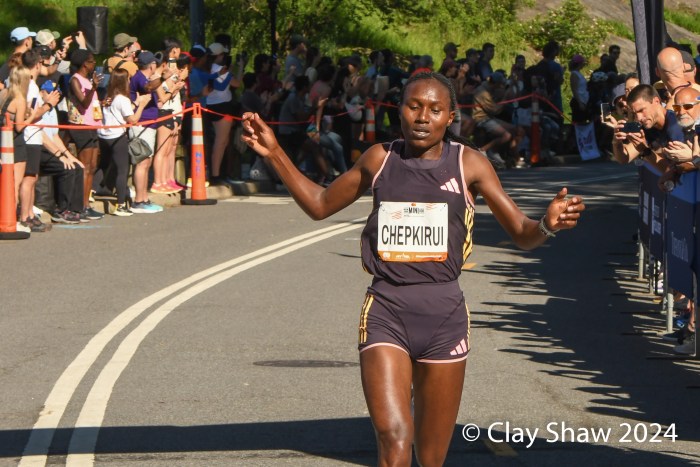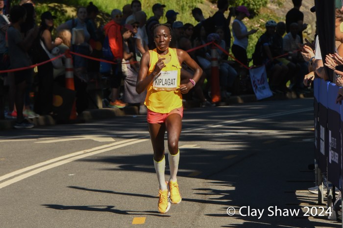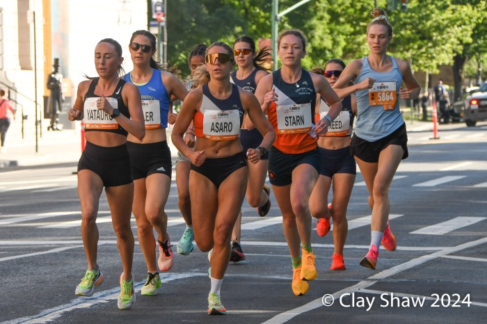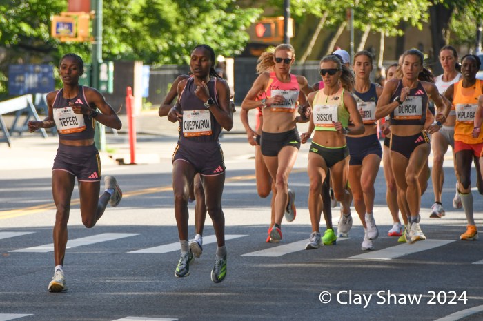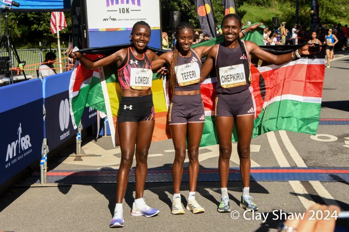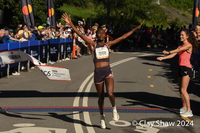 June 8, 2024, New York, NY—Senbere Teferi accomplished a three-peat at the Mastercard New York Mini 10k. Teferi won her third straight with a 30:47 win. She had company for most of the race, with 2022 NYC Marathon champ Sharon Lokedi and Sheila Chepkirui, both of Kenya, running in a three-woman pack. On a downhill at 5.4 miles, Teferi surged and broke the race open to win by 17 seconds.