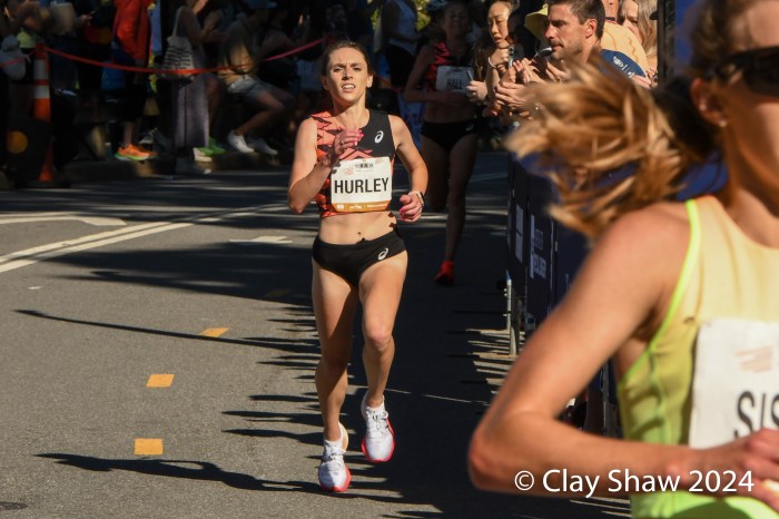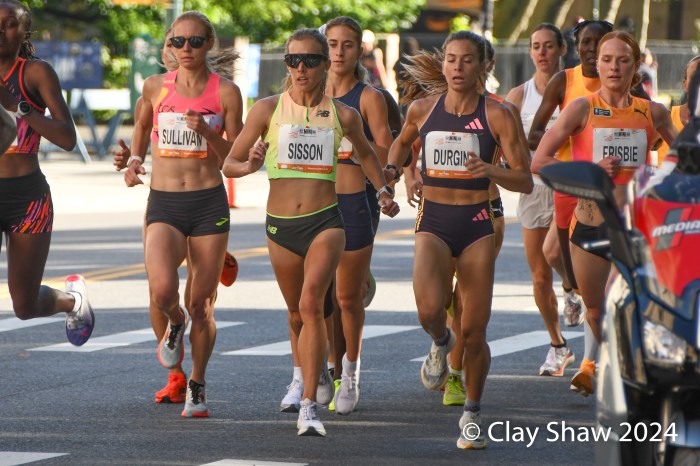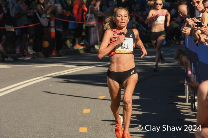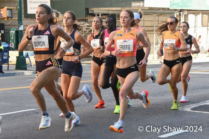 Emily Durgin, Amanda Vestri, Sara Hall, and Annie Frisbie race on Central Park West. Lily Partridge of GBR is also in the mix.