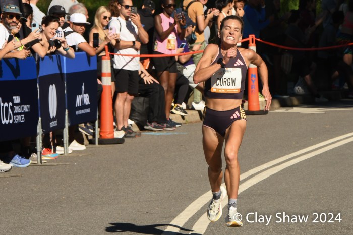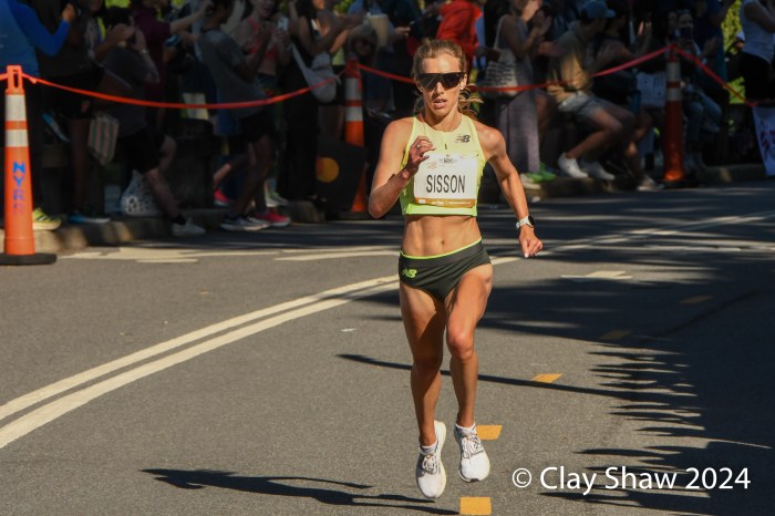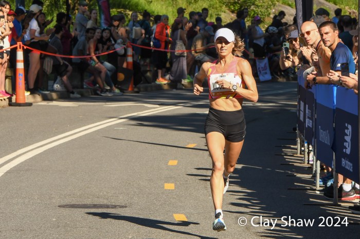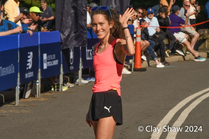 USA Olympian marathoner Fiona O’Keeffe says hello to the NYC crowd.