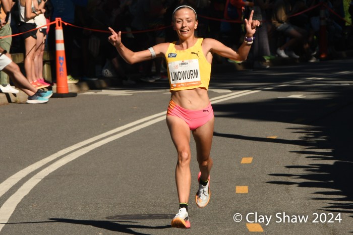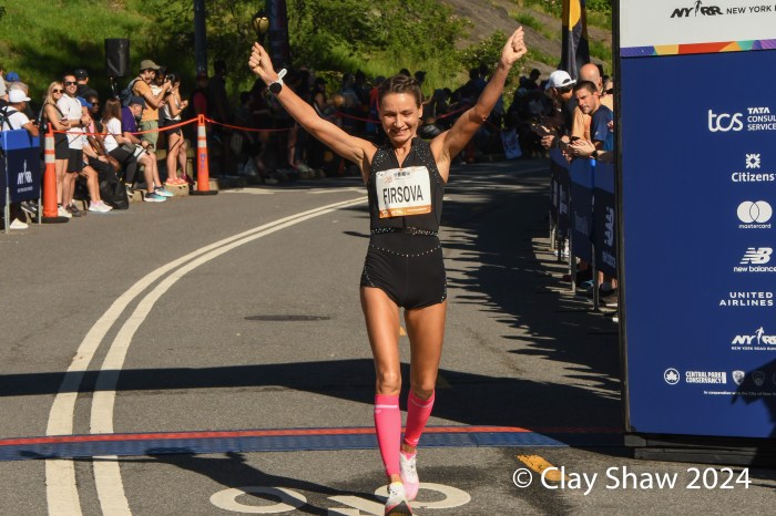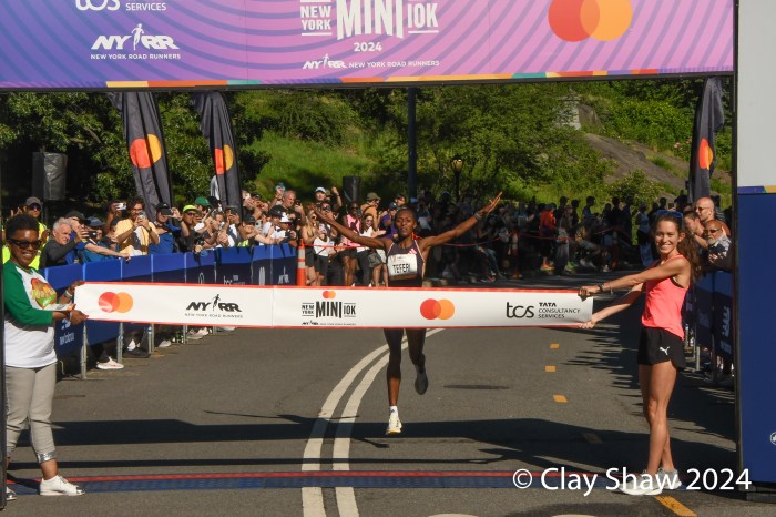Senbere Teferi of Ethiopia is jubilant after winning the Mastercard New York Mini 10k for the third time. USA Olympic Marathon Trials champion Fiona O’Keeffe was one of the banner holders.