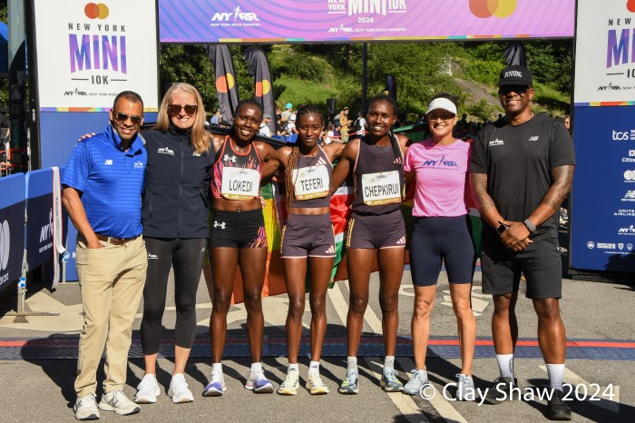 Rob Simmelkjaer, CEO, NYRR; Christine Burke, Senior Vice President, Strategic Partnerships & Runner Products, NYRR; Sharon Lokedi, 2nd place; Senbere Teferi, 1st place; Sheila Chepkirui, 3rd place; Nnenna Lynch, Chair, Board of Directors, NYRR; Ted Metellus, Senior Vice President, Events, Race Director, TCS New York City Marathon, NYRR