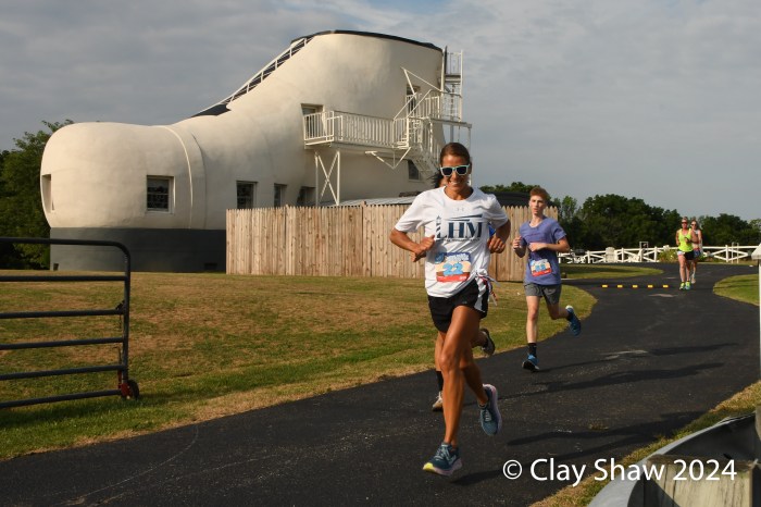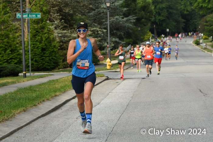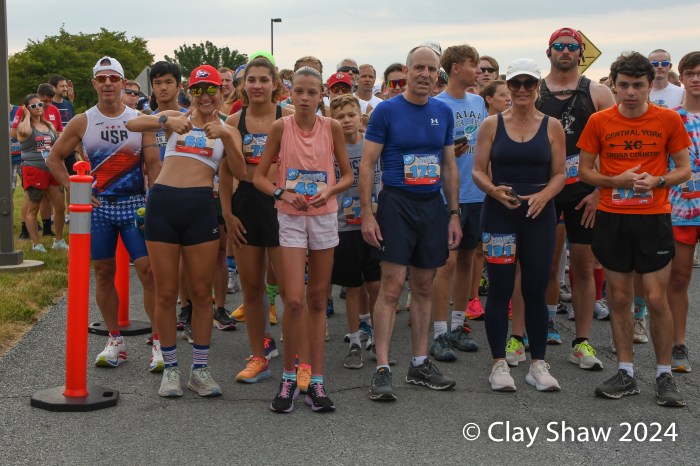 July 4, 2024, York, PA—Joanna Hayes of Dillsburg, the 2021 Baltimore Marathon winner, had to find her way around the 5-mile course, and she did it winning in 33:27. The weird thing is the two guys who had a lead bike and ran 28:18 and 28:28 respectively, were out of Joanna’s sight for the second half of the race, as they were five minutes ahead. Young Lyla Eltz of Hanover was with Hayes for the first few miles, before the marathoner pulled away, finishing completely alone.
