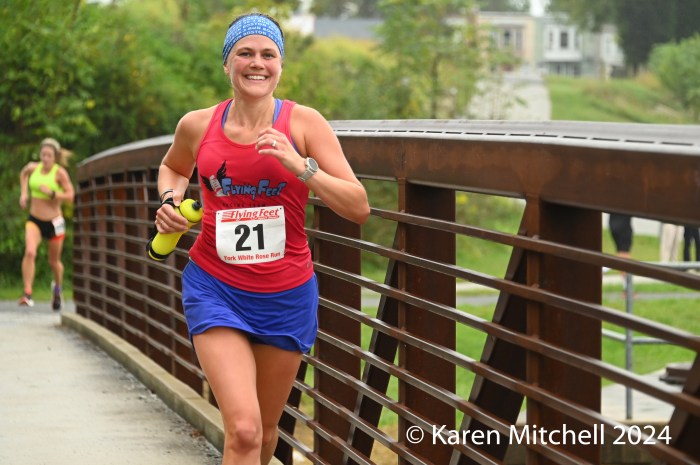 York, PA; September 28, 2024—Zoë Matherne of Philadelphia returned to the York White Rose Run to win her fifth WRR title. Matherne was out front all the way and won in 28:58. Only eight men finished in front of her.
