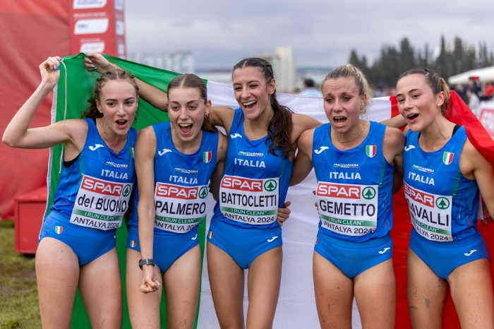 Nadia Battocletti of Italy, in her first race as a “senior” (she’s 24), pulled away to a 9-second win in 25:43 on the 7.5 km course. With this win, she has become the first female athlete in history to take gold in every age group, U20, U23, and Senior at SPAR European Cross Country Championships!!! Konstanze Klosterhalfen of Germany was second in 25:54 as she returns to good health after picking up a wicked virus in Ethiopia that knocked her out of the Paris Olympics and other 2024 events. Yasemin Can of host country Turkey was third in 26:01. Delvine Meringor of Romania, a 2:20 marathoner, was fourth in 26:03. Jana Van Lent of Belgium was the surprise fifth place finisher in 26:04. Italy won the team competition, with Great Britain in second and Belgium in third. 79 athletes finished the course that had multiple laps and man-made obstacles consisting of sand, mud, logs, and a hurdle made of upside-down broom heads.