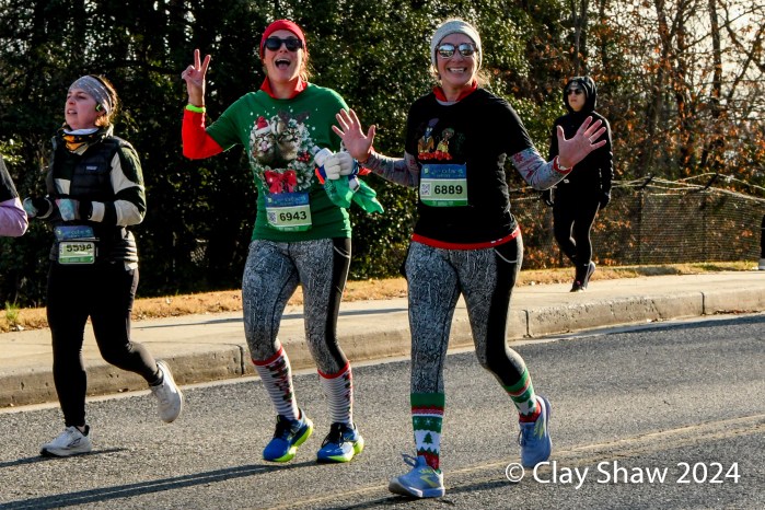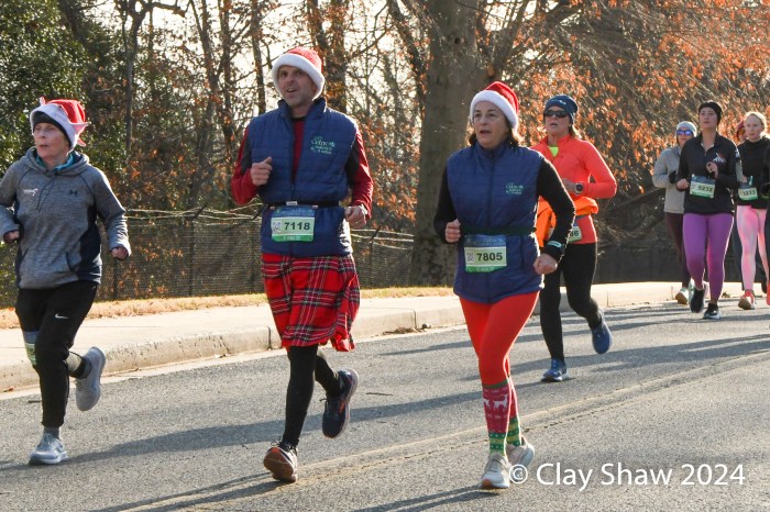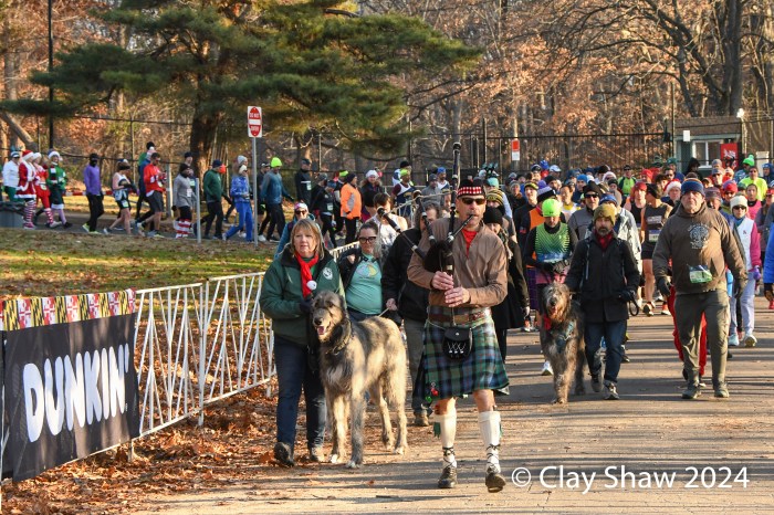 The Celtic Solstice is a festive Celtic and Christmas-themed event, that basically wraps up the yearly race calendar. Jim Adams and Karen Menge, the former directors and founders of the event, flew in from Vista, CA for the festivities. Corrigan Sports Enterprises has been in charge race operations since 2021. The premium, always very nice, was an awesome winter vest with a Celtic logo. The usual festivities included the bagpiper and Irish Wolfhounds leading the runners to the start line. The race also features wine, coffee, hot chocolate, cookies, and an Irish Band, along with yearly age-group-ornament awards. Those interested can take photos with the big, gentle Irish Wolfhounds.