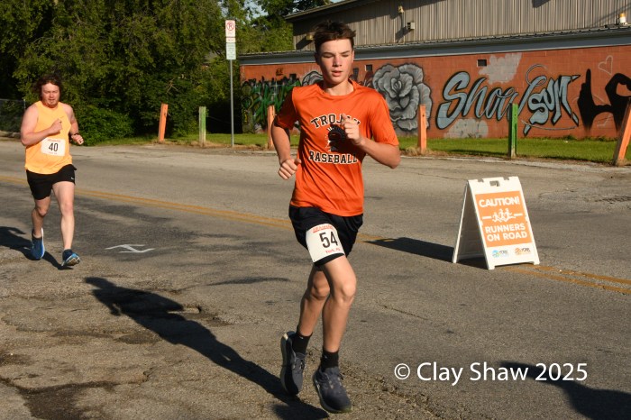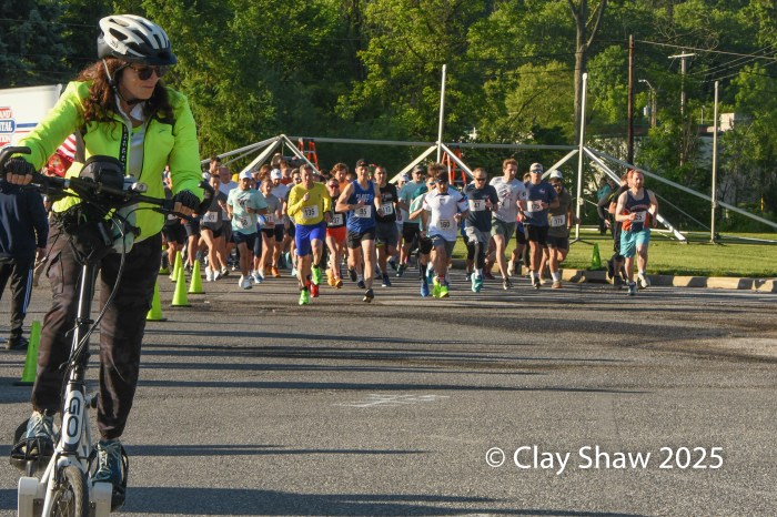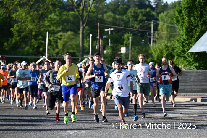 Donovan Trauger of York #160 leads the 2025 Gold Star 5k field at the start. Trauger won the 2024 event and was second in 2025, even though he was over a minute faster.