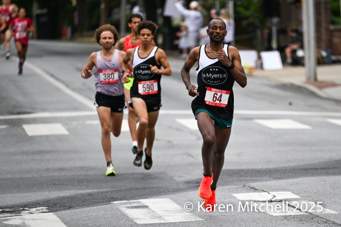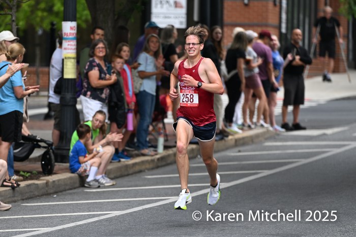 Dan Forry of Columbia, winner of the 2024 York White Rose Run was second in 26:14, running for the Philadelphia Runner Track Club. Matthew McNair of Lancaster was third in 26:16, as he and Bereda run for the Myers Running Project. Ciaran Fisher of Marion Heights, PA and Danbury, CT and running for the newly kitted Red Rose Track Club was fourth in 26:36. Nathaniel Alter of Lancaster was fifth in 27:01. Two-time Red Rose champ Otis Ubriaco of Lancaster was sixth in 27:08. The first master was Alex Pearson of Hummelstown in 28:12; he was fifteenth overall.
