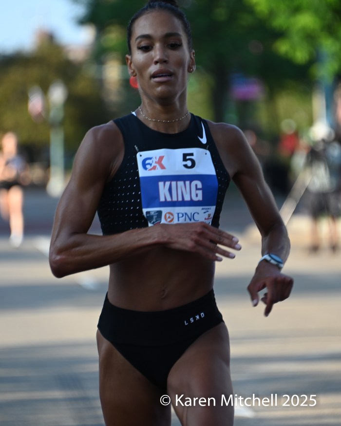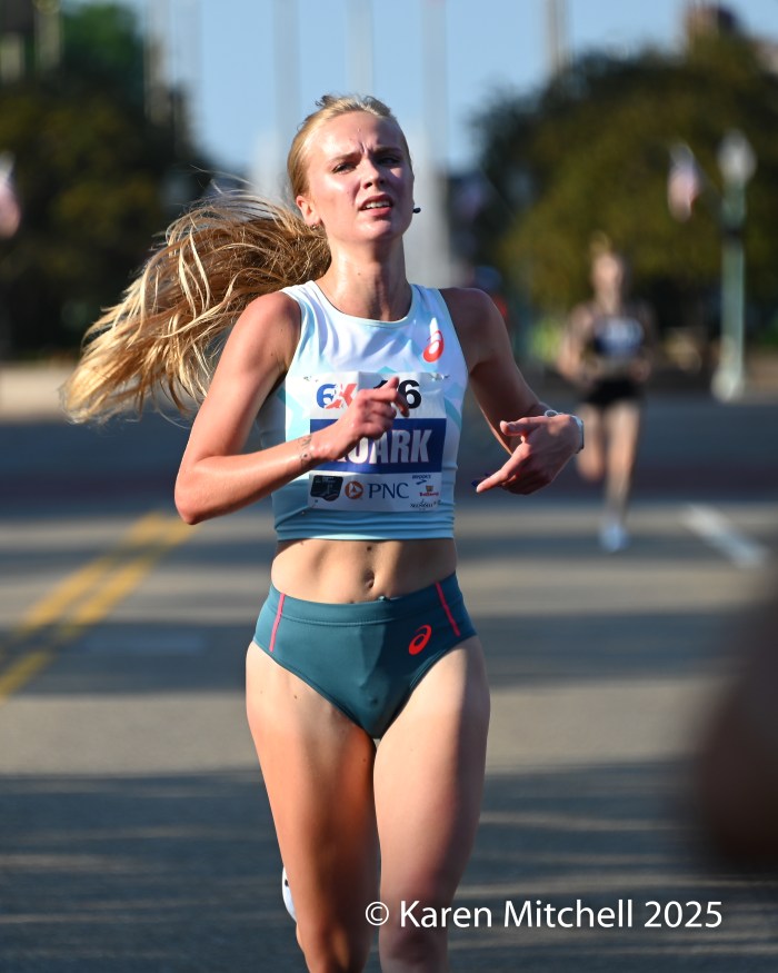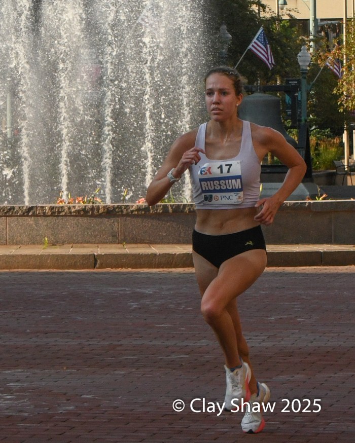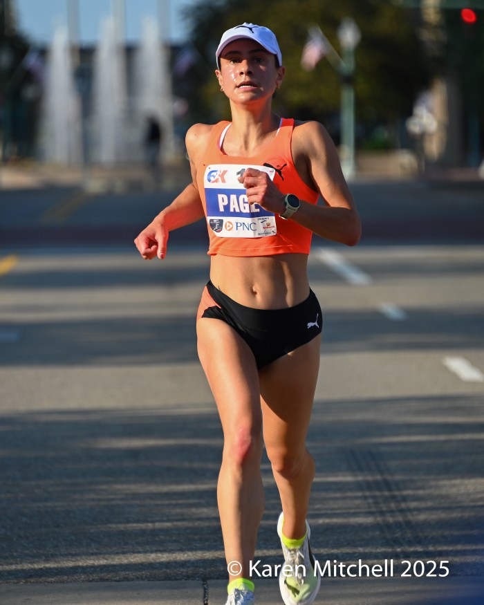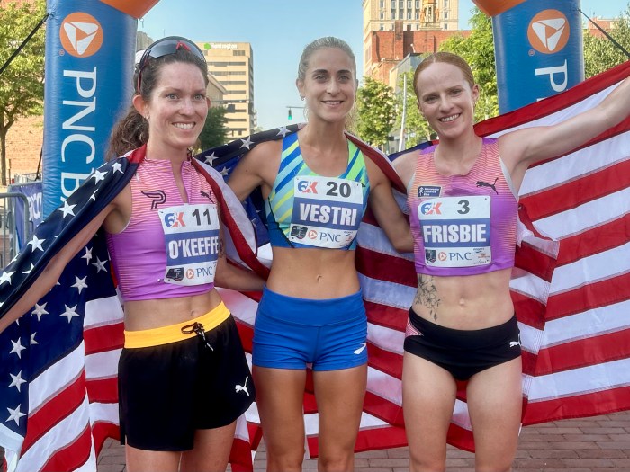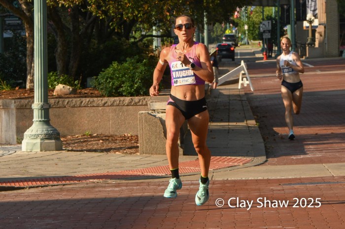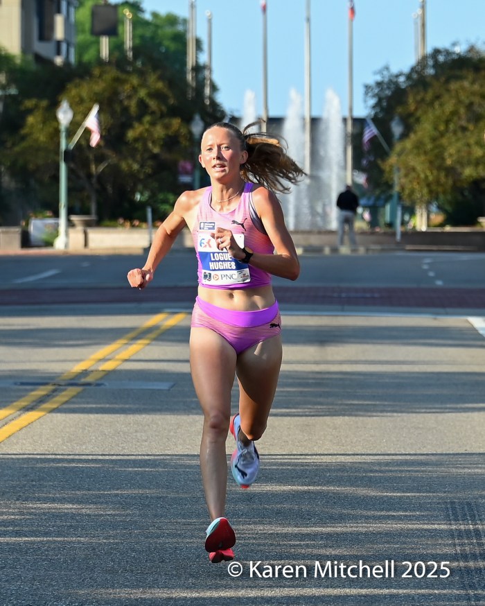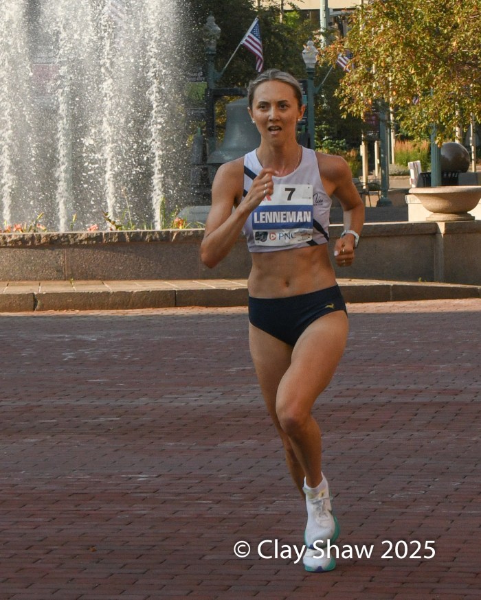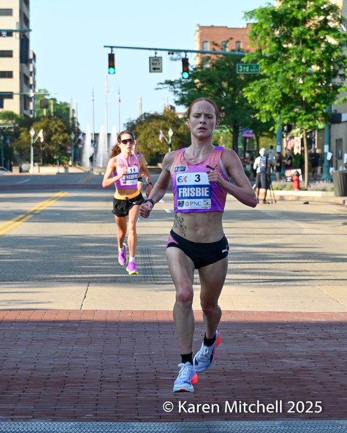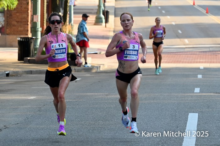 Marathoners Annie Frisbie of Hopkins, MN, and Fiona O’Keeffe of Durham, NC ran together much of the race chasing Vestri. Frisbie finished second in 18:36. O’Keeffe was right behind in third in 18:38. Molly Born of Chapel Hill, NC was fourth in 18:41. Ednah Kurgat of Colorado Springs, CO was fifth in 19:05.