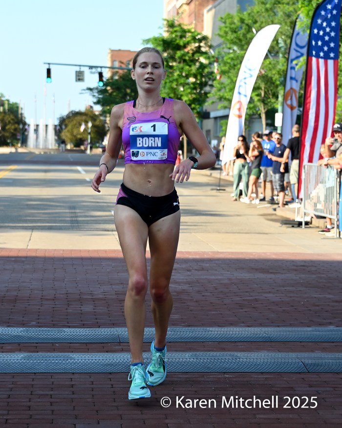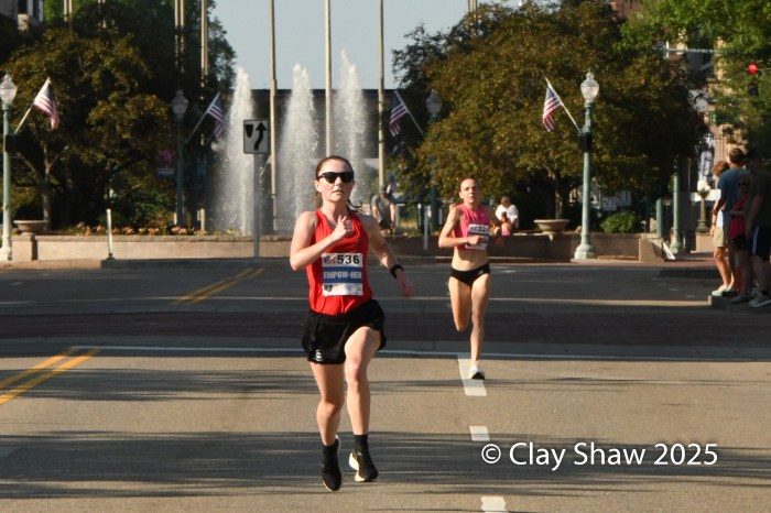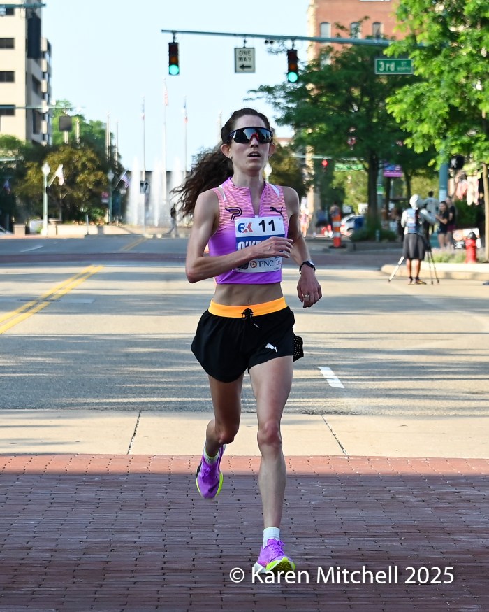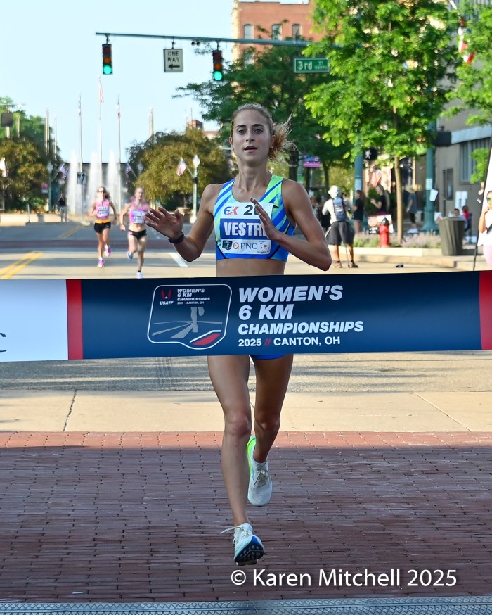7.12.25 Canton, OH—Amanda Vestri of Blowing Rock, NC and Zap Fitness, used her course knowledge to break open the 6k early in the race. Vestri broke away around 1 mile and ran strong throughout, winning comfortably in 18:29.