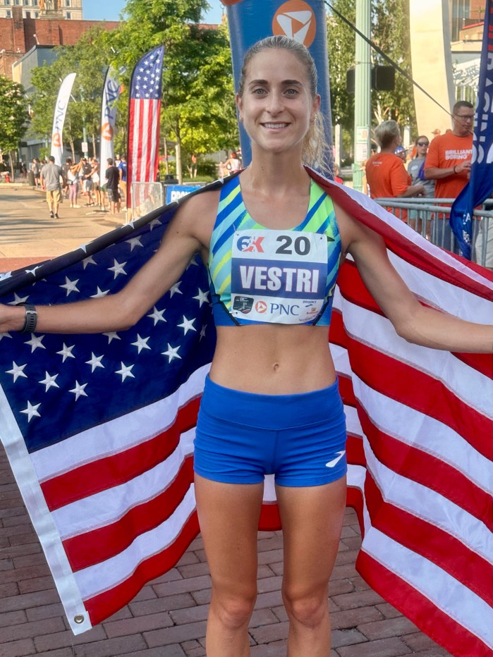 Amanda Vestri of Blowing Rock, NC wins the USATF Women’s 6K Road Championships in 18:29.