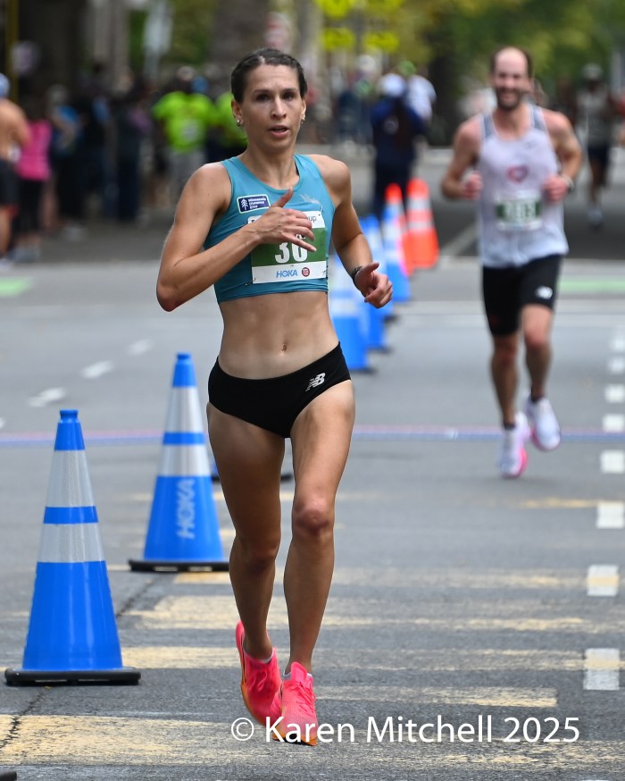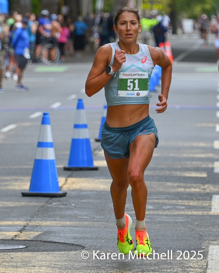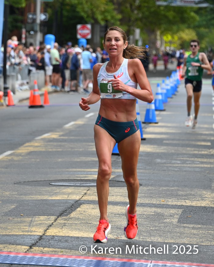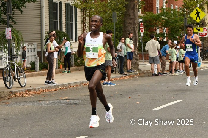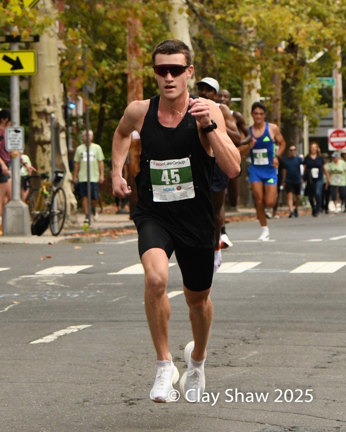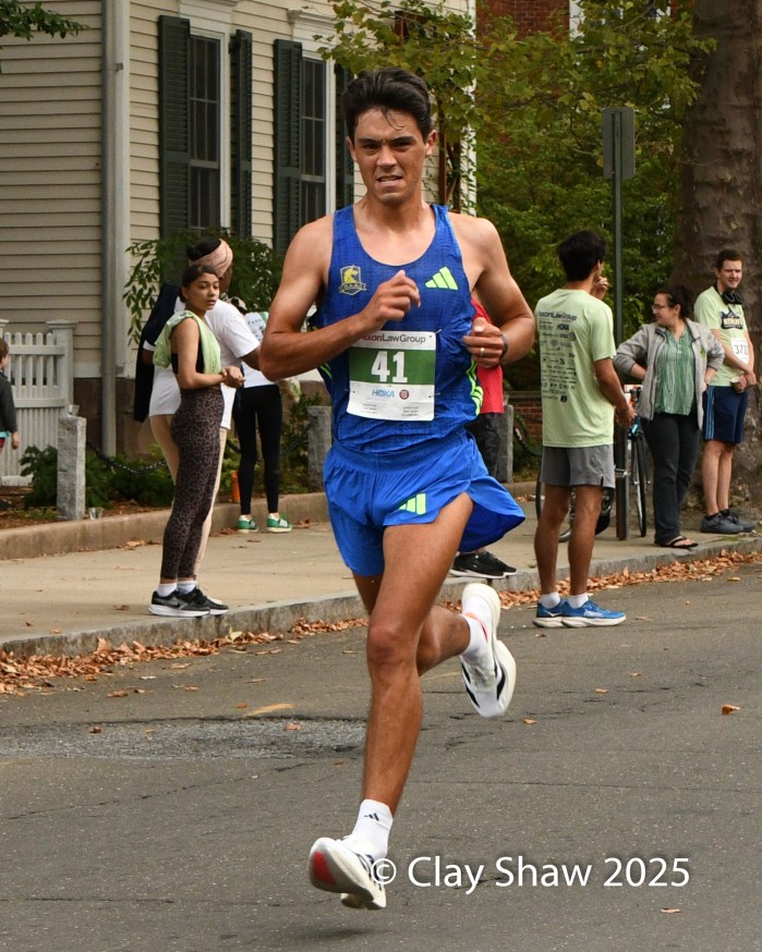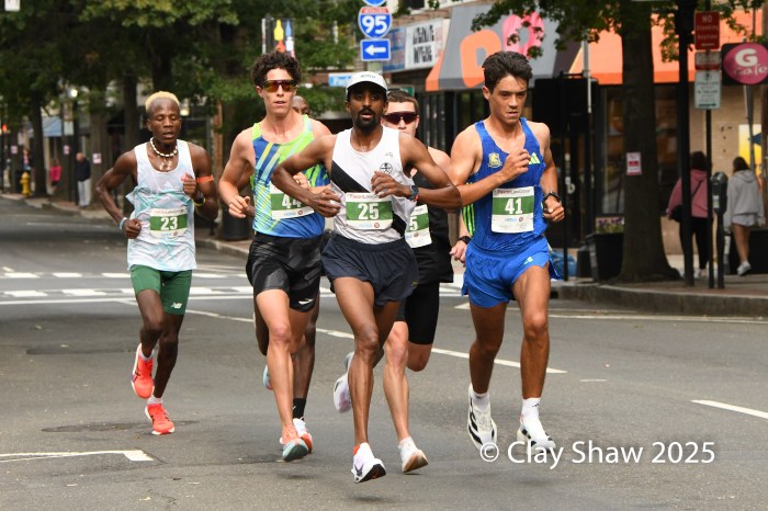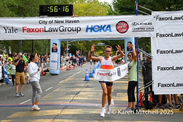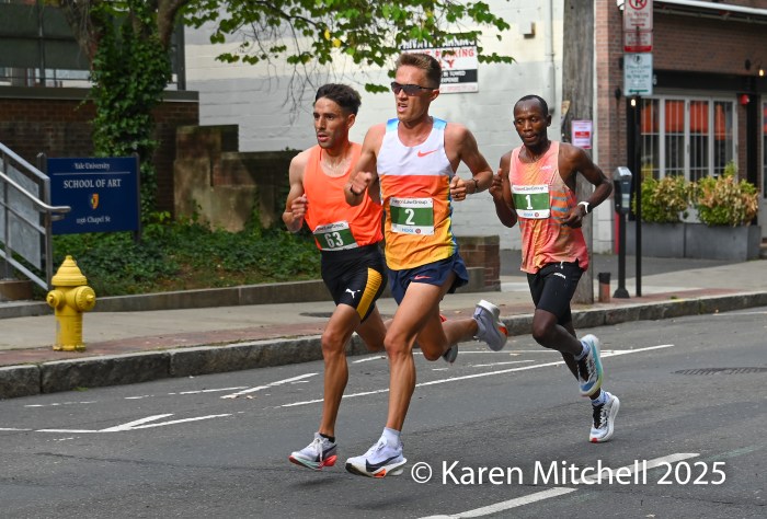 Mantz, along with 2024 New Haven Road Race champion Hillary Bor of Colorado Springs and Isai Rodriguez of Durham, NC, broke away from the rest of the men early and it became a three-man race most of the way. Record setting is helped by great completion, athlete fitness, and a bit of luck with weather. It was cool with a light, cloudy layer, low 60’s, ideal racing weather for Labor Day. Bor was second in 56:32. Isai Rodriguez was third in 56:34. All three men were well under the course record of 57:37 that was set in 1998 by Khalid Khannouchi. Zouhair Talbi of Colorado Springs ran alone most of the race and finished fourth in 57:40. Casey Clinger of Provo, UT was fifth in 58:05.