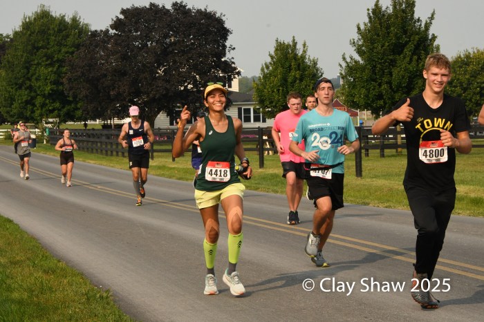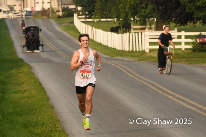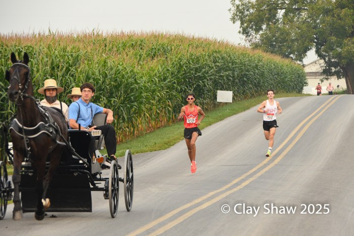 9.6.25 Bird-in-Hand, PA—Lianne Pagano of Boston, MA and Bryce Hampton of Lancaster, PA were the winners of the 2025 Bird-in-Hand Half Marathon. Pagano won in 1:22:45, with only six men in the 1805 runner field finishing ahead of her. Hampton had a strong race, too, winning in 1:13:27 on the Lancaster County hills in Amish farmland.