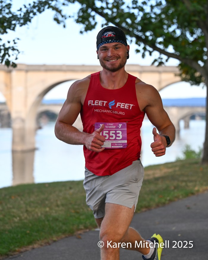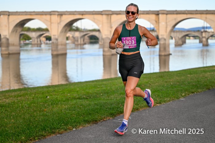 Christina Thompson of Pittsburgh was second in 1:26:56. Amanda Shultz of New Cumberland was third in 1:31:46. Teal Liu of Hershey was fourth in 1:31:50. Rachel Aslan of Camp Hill was fifth and top master in 1:34:12. A good age group ace Katherine Shank, 63, of Harrisburg placed twelfth overall in 1:39:15.