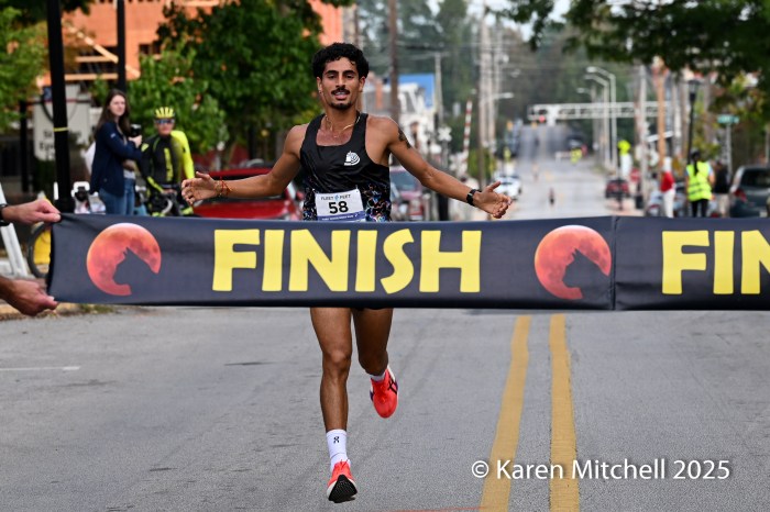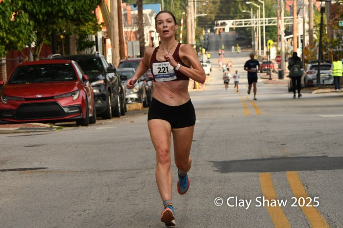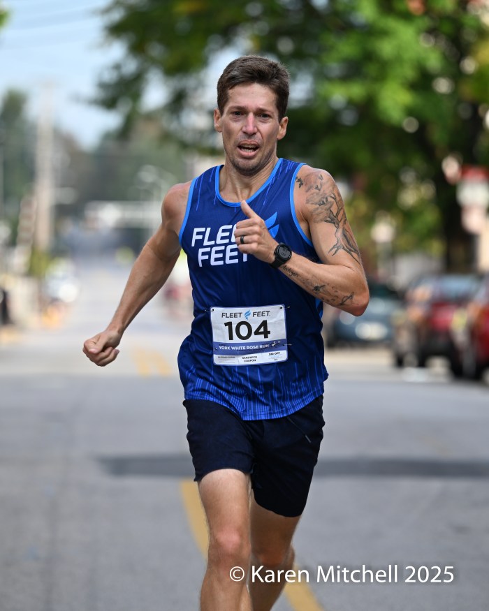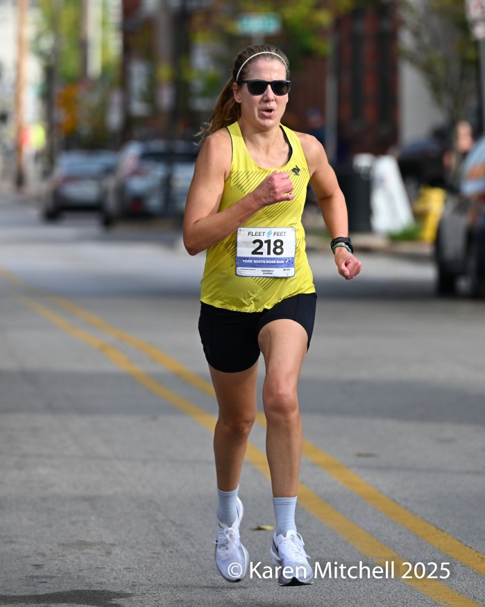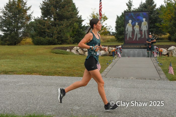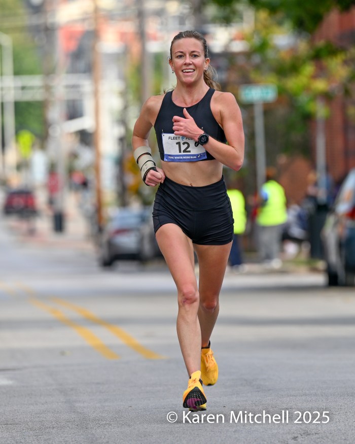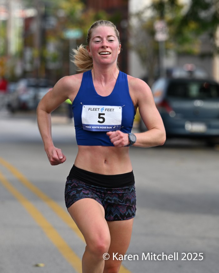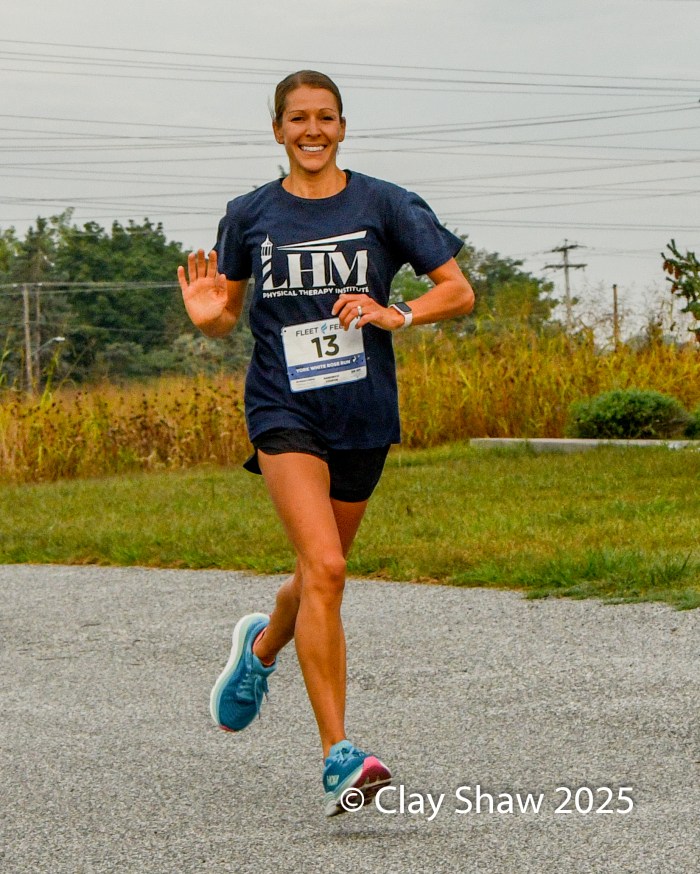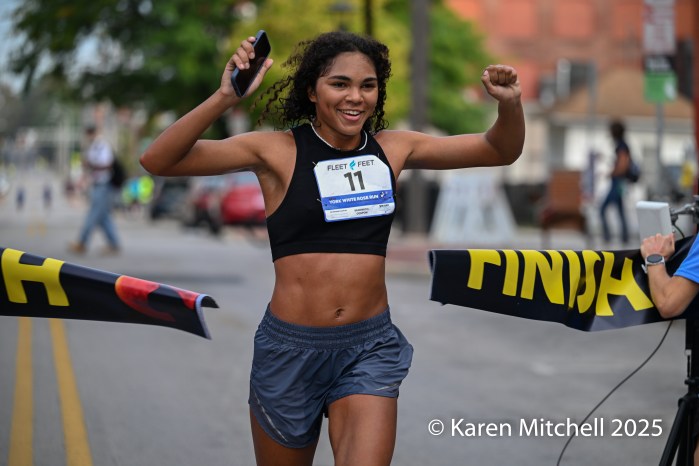 9.27.25 York, PA—Nicole Register, 22, of Jacobus, PA who has placed well in previous editions of the York White Rose Run 5 Miler, took the women’s division in 31:25. The new course features middle miles in Prospect Hill Cemetery (yes, hills). It’s an historic cemetery with old and new, with a 9-11 tribute and a solemn monument to fallen firefighters and police officers. The course started on West Philadelphia St. over the Codorus Creek (why is this not a river?) and finished at it’s usual North Beaver and Philadelphia Street finish line.