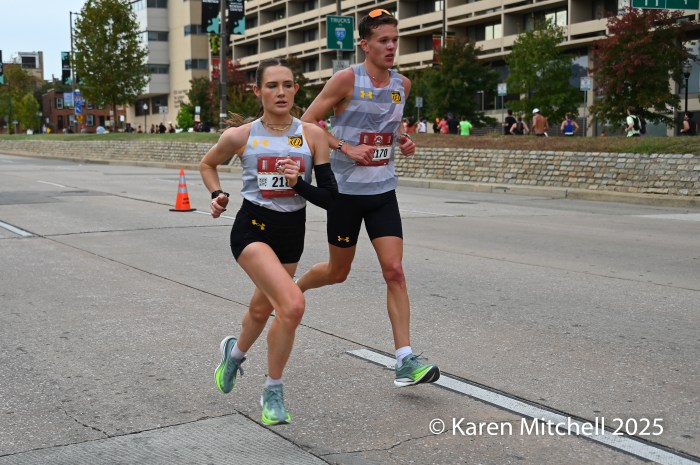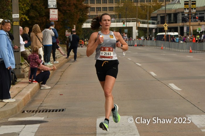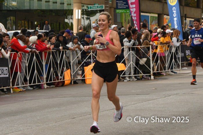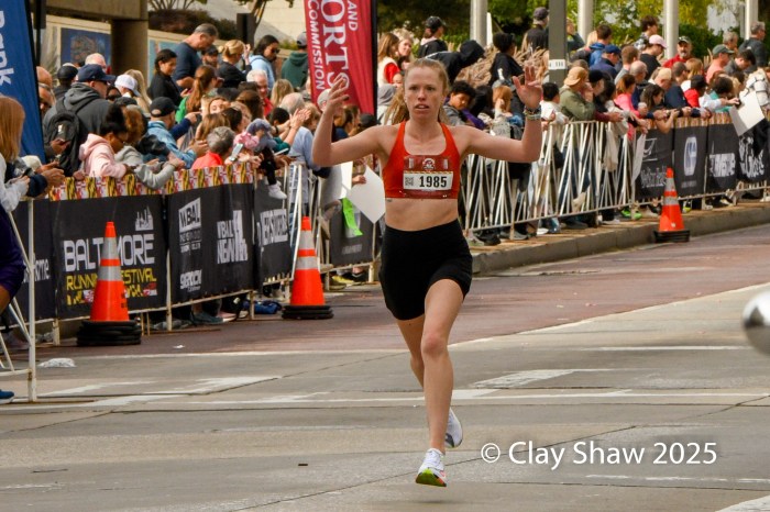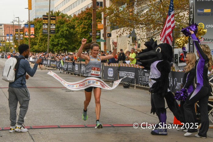 10.18.25 Baltimore, MD—Rachel Cluett of Garrett Park, MD ran strong over the final six miles to earn a victory in 2:53:12. 2024 NCR Marathon champ Liz Ozeki of Rockville, MD was second in 2:54:13. Jennifer Stephenson of Baltimore was third in 2:54:40. Charity Chaser for ASA (Athletes Serving Athletes) Hannah Betman of Baltimore, started last and passed 2066 runners on her way to a fourth place finish, 2:59:51. Corrigan Sports Enterprises donated $2 to ASA for every person that Hannah passed, totaling $4,132. Betman is a 2020 Olympic Marathon Trials qualifier with a 2:40:49 personal best. Hannah Flinchum of Gaithersburg, MD was fifth in 3:05:56. The first master and ninth overall was Brenda McRae of Sandy Hook, CT in 3:09:33.