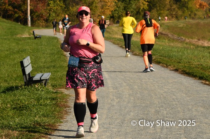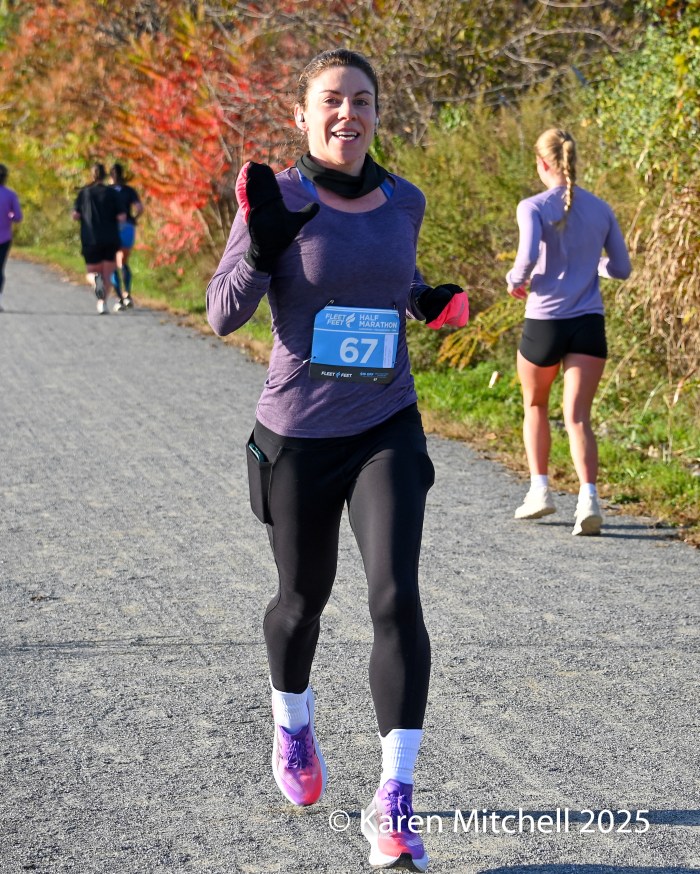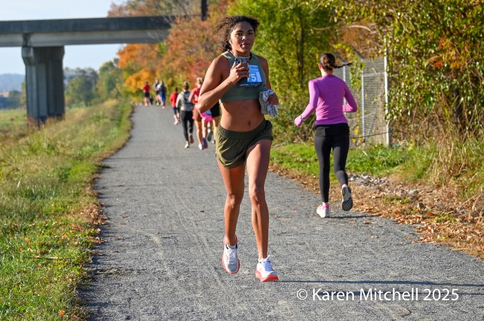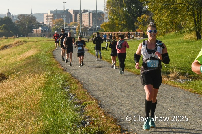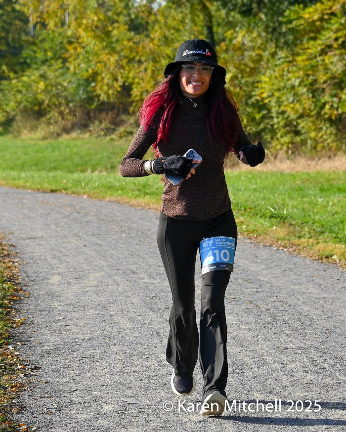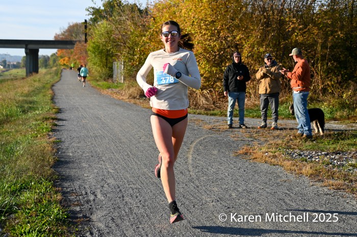 10.26.25 York, PA—Leila Mantilla of Havertown, PA and the Liberty Track Club blitzed the new race course from John Rudy Park to York City and back, on the York Heritage Rail Trail. Her time of 1:17:59 was only topped by the first two men.