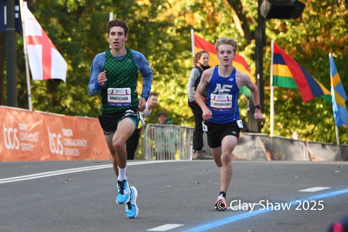 Vidal Macchia of Shirley, NY races with Tyler Mogavero of Haverhill, MA in the USATF Boys 5K Championships. Macchia won 16:35 to Mogavero’s 16:37.