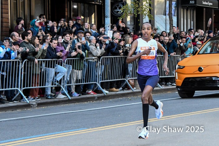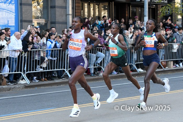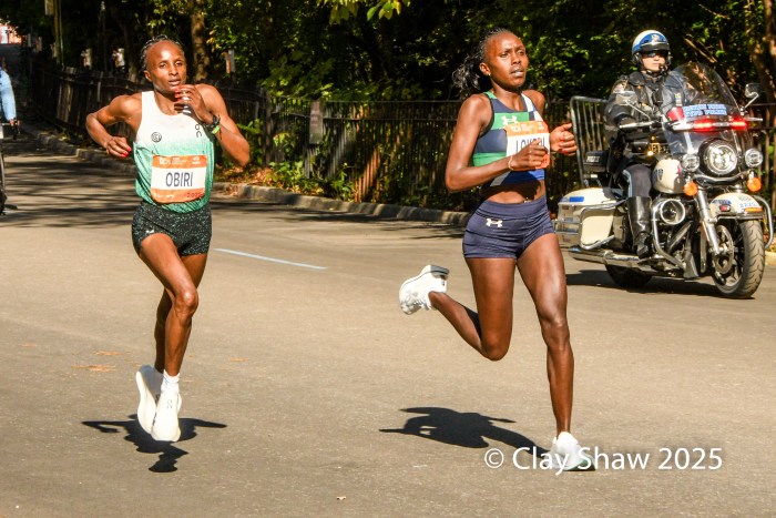 11.2.25 New York, NY—Hellen Obiri of Kenya stressed that patience was the key element in her record setting victory at the 54th TCS New York City Marathon.  Obiri, the 2023 champion, waited until 59th Street in the final mile to surge powerfully on the slightly uphill final stretch to the finish line in Central Park. She set a record New York City Marathon time of 2:19:51. Sharon Lokedi of Kenya, the 2022 NYC champion and the 2025 Boston Marathon champion, was second in 2:20:07. Sheila Chepkirui of Kenya, the 2024 champ, was third in 2:20:24.  All three broke the long standing 2:22:31 record set by Margaret Okayo of Kenya in 2003.