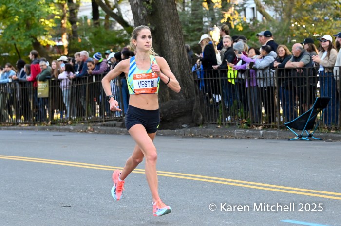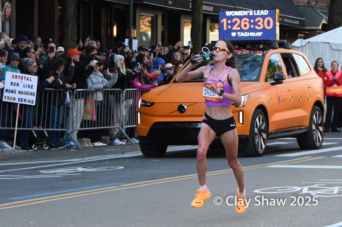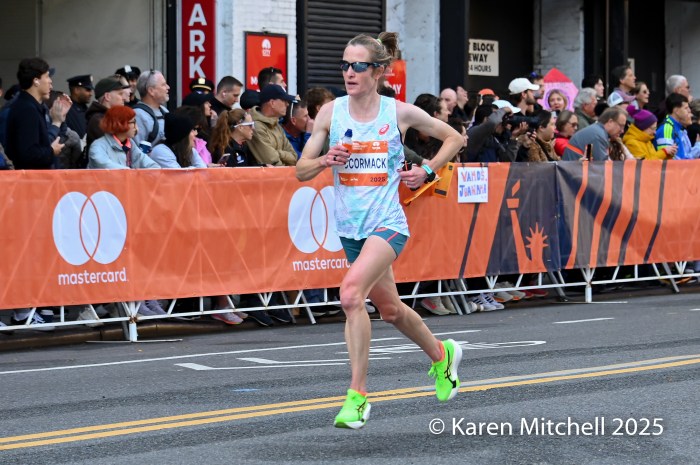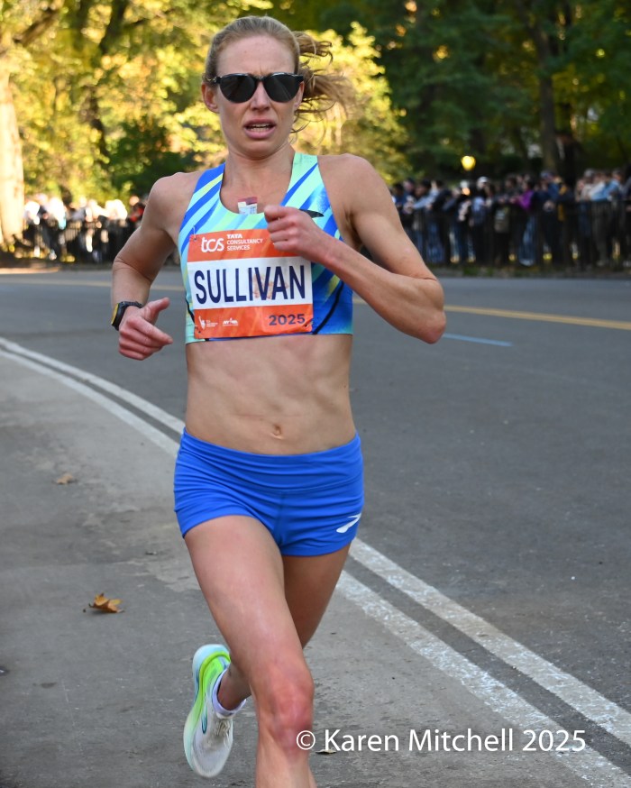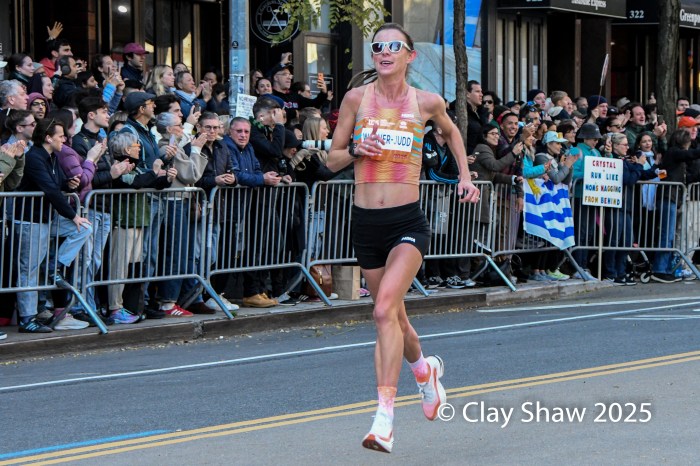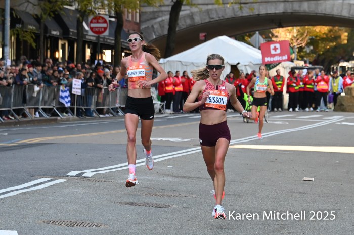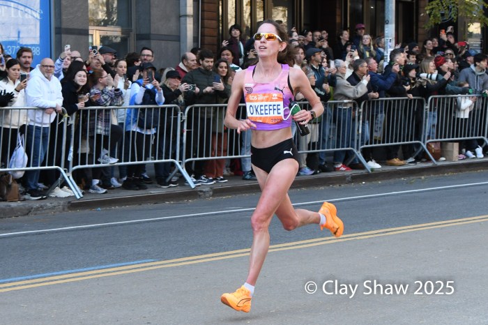 Fiona O’Keeffe of Cary, NC set a new USA New York City Marathon record of 2:22:49 and chased and caught up to the leaders on 1st Avenue.
