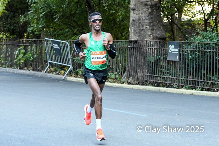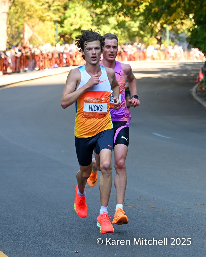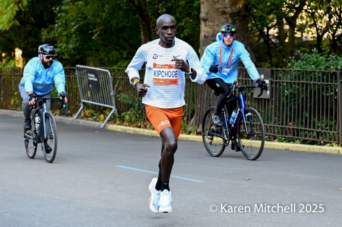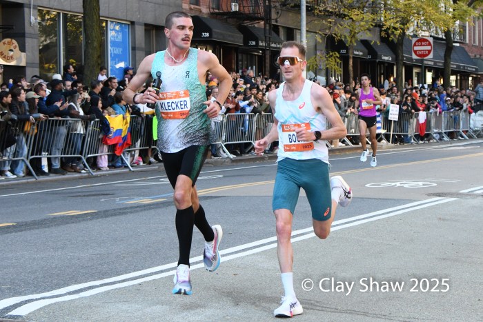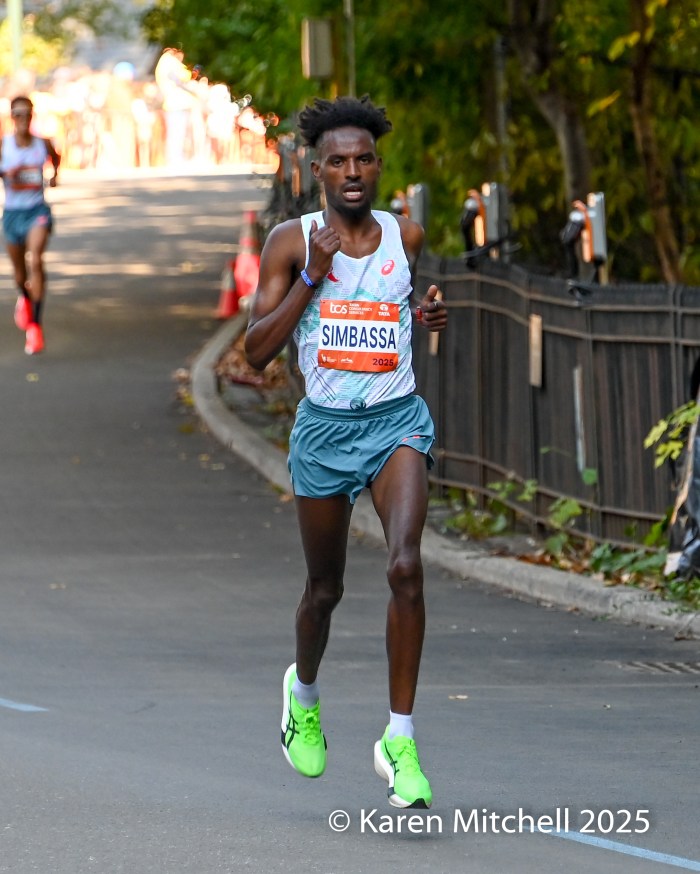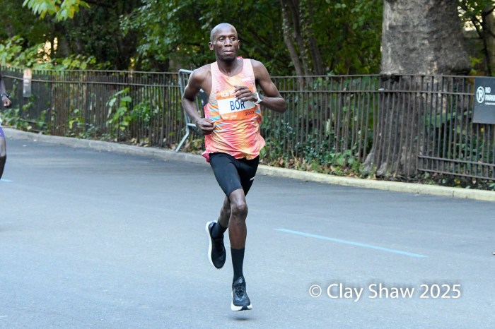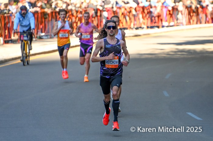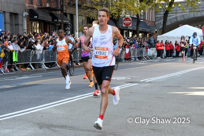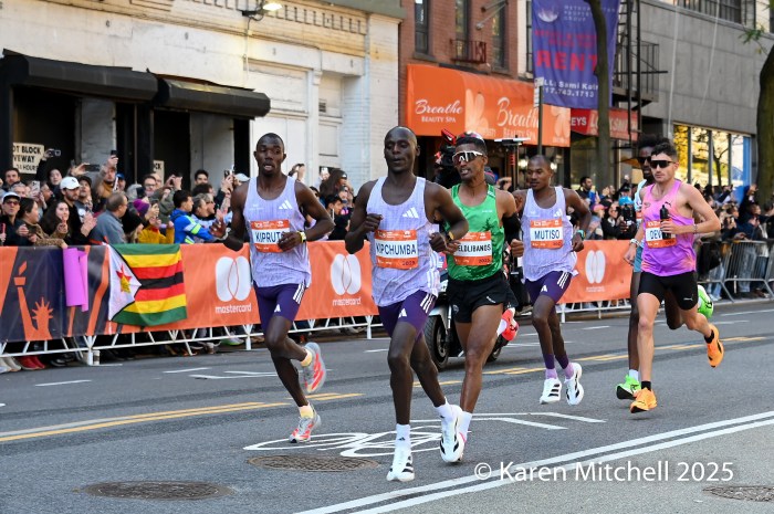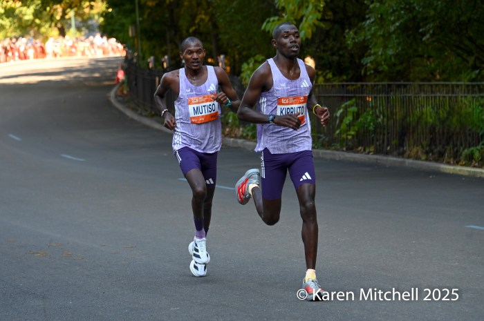 Benson Kipruto had a “shadow” for the latter part of the marathon in the name of Alexander Mutiso.  Both Kenyan runners, with matching Adidas kits, were nearly inseparable, even at the very end. Kipruto opened a bit of real estate nearing the finish, but Mutiso roared back.  Kipruto won by half a step, both timed in 2:08:09.  The closest race in New York Marathon history was also the world’s largest, with 59,226 finishers. Albert Korir of Kenya, the 2021 champion, ran his fifth NYC Marathon and earned his fourth podium, finishing third in 2:08:57.  Patrick Dever of Great Britain, running his debut marathon, was fourth in 2:08:58.  Matthias Kyburz of Switzerland was fifth in 2:09:55. American Joel Reichow of St. Paul, MN was sixth and top American in a personal best of 2:09:56. Charles Hicks of Eugene, OR had a strong debut, placing seventh in 2:09:59.  Daniele Meucci of Italy was top master in 2:10:40, placing eleventh.  Nice debuts by Americans Joe Klecker of Boulder, CO in 2:10:37 placing tenth and Hillary Bor of Colorado Springs in 2:10:47 placing twelfth.  Legendary marathoner Eliud Kipchoge, 40, of Kenya earned his 6-star Abbott World Major medal, placing 17th in 2:14:36.