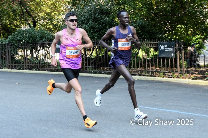 Patrick Dever of Great Britain races Albert Korir of Kenya near mile 25 of the TCS New York City Marathon. Dever was fourth in his debut in 2:08:58. Korir made his fourth NYC podium, placing third in 2:08:57.