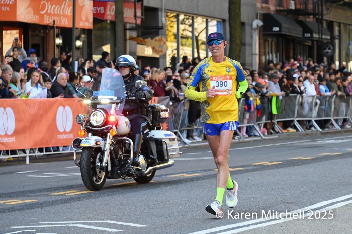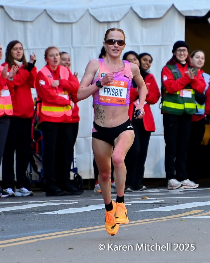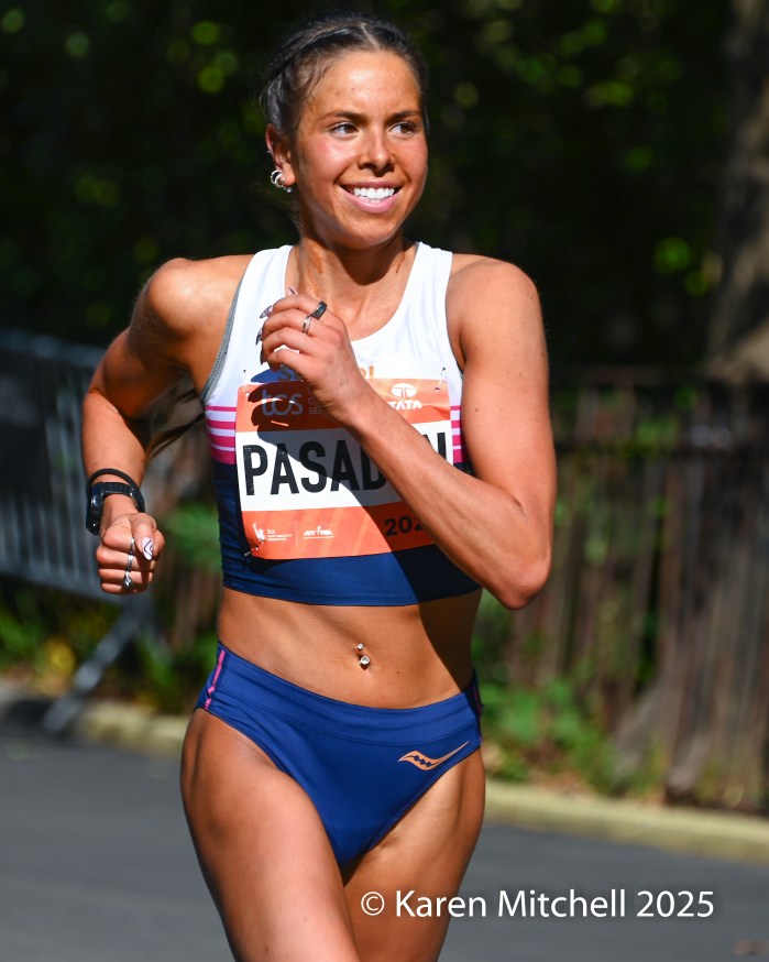 Susannah Scaroni of Champaign, IL “feeling good and having a great season.” Scaroni won her third NYC in 1:42:10. Scaroni has 2025 victories in Boston, Sydney, Chicago, and New York.