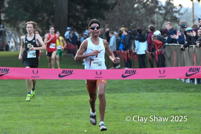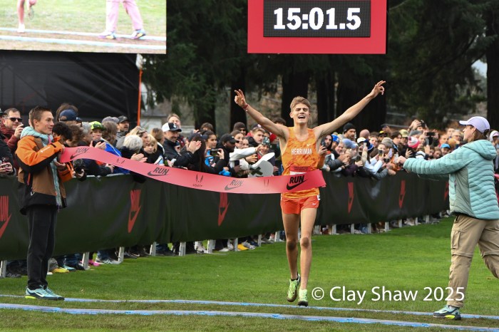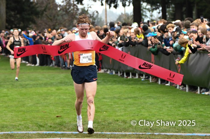 12.6.25 Portland, OR—Parker Wolfe, 22, of Nike Swoosh TC and University of North Carolina won the USATF 10km in 29:16.4 on the muddy Glendoveer Golf Course route. Wolfe will lead the top six athletes to represent the USA in the World Cross Country Championships in Tallahassee, FL on January 10, 2026.