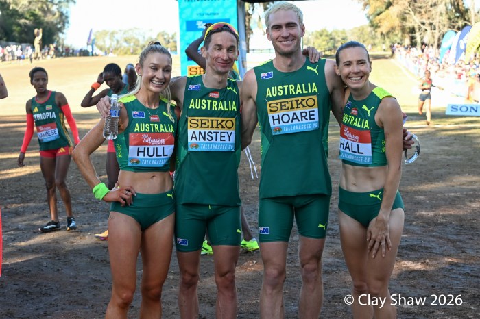 Happy Australians after winning the World XC mixed relay. Jessica Hull, Jack Anstey, Oliver Hoare, and Linden Hall.