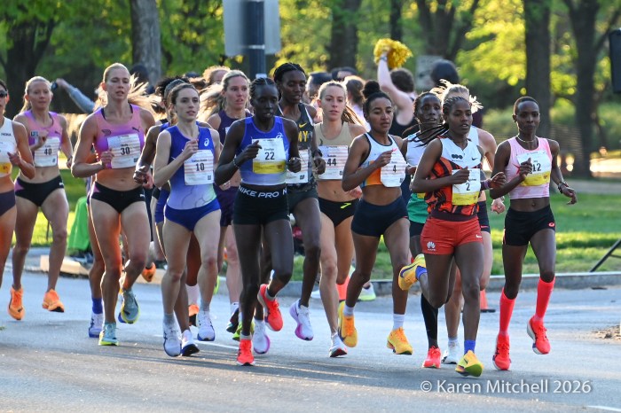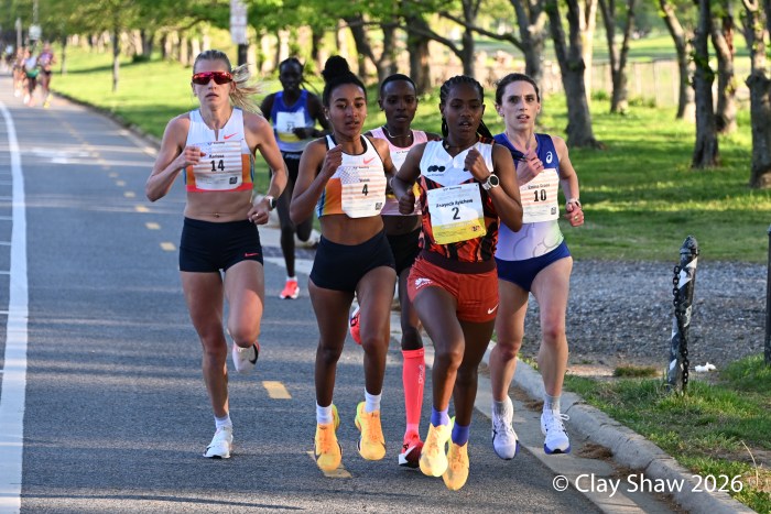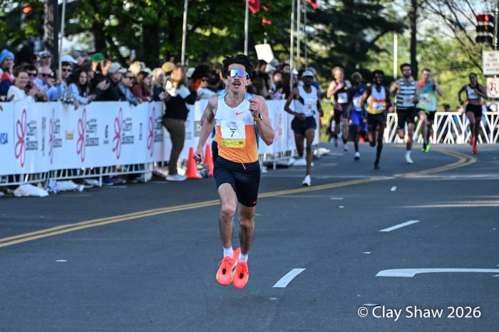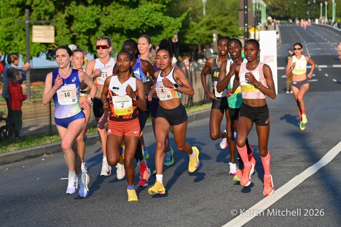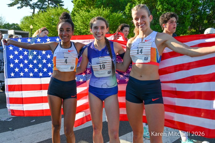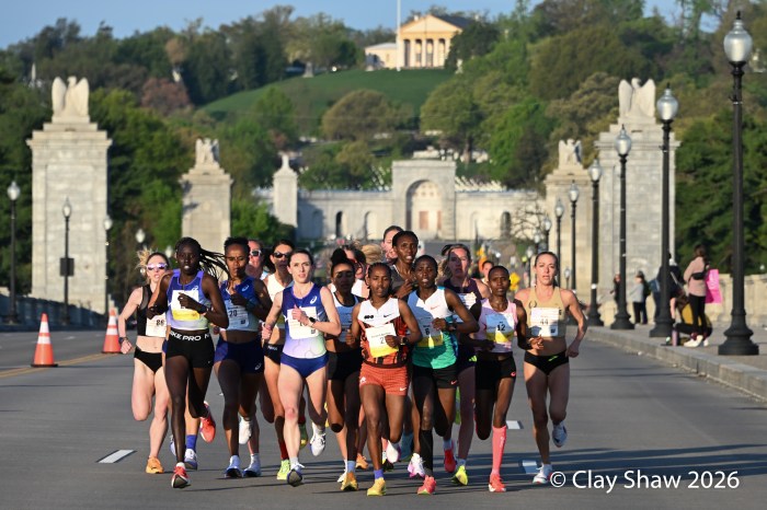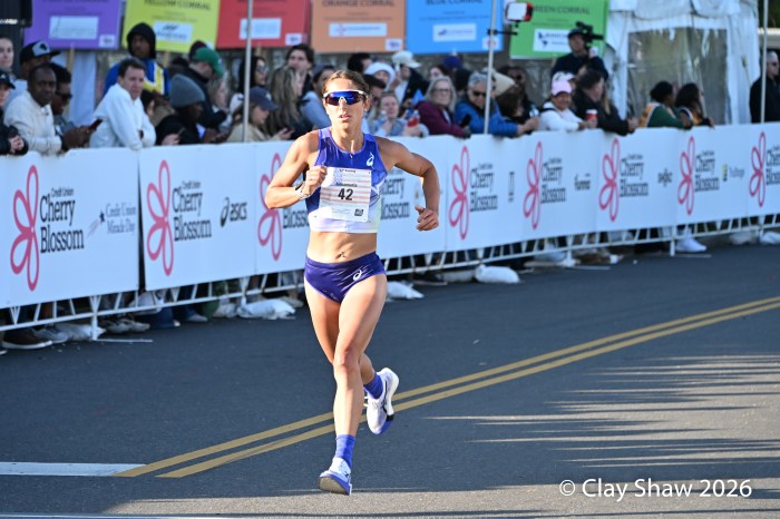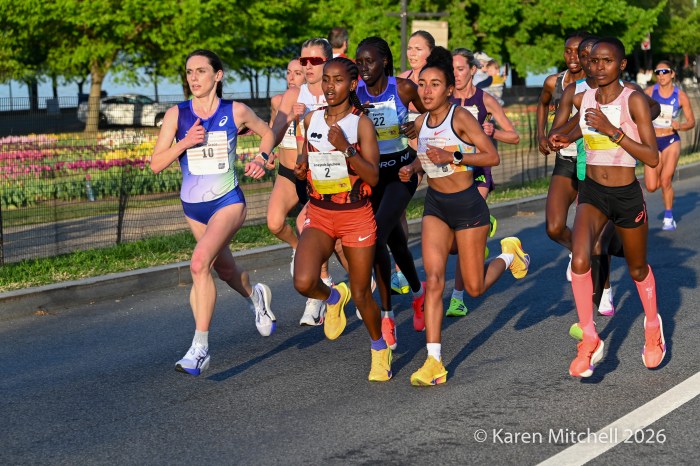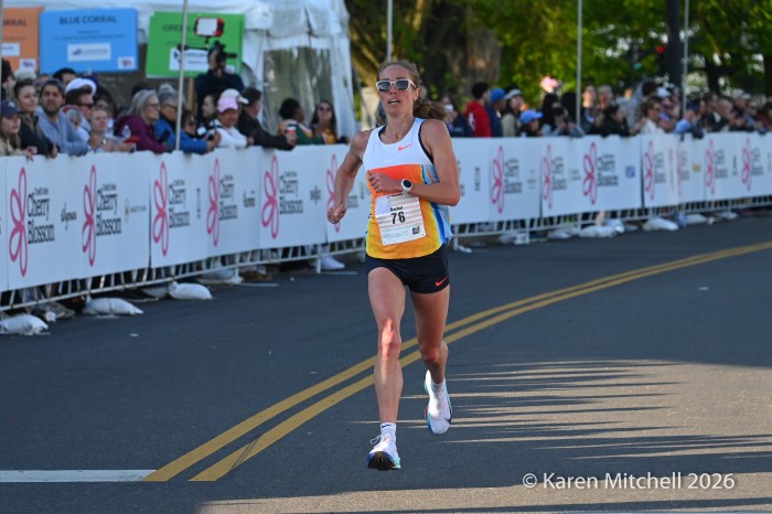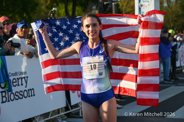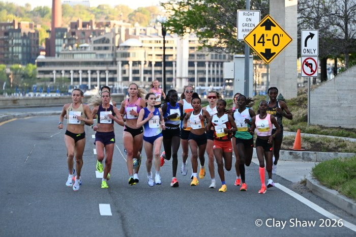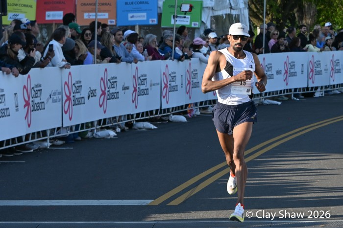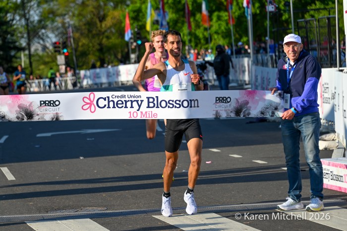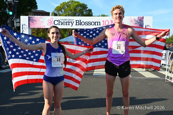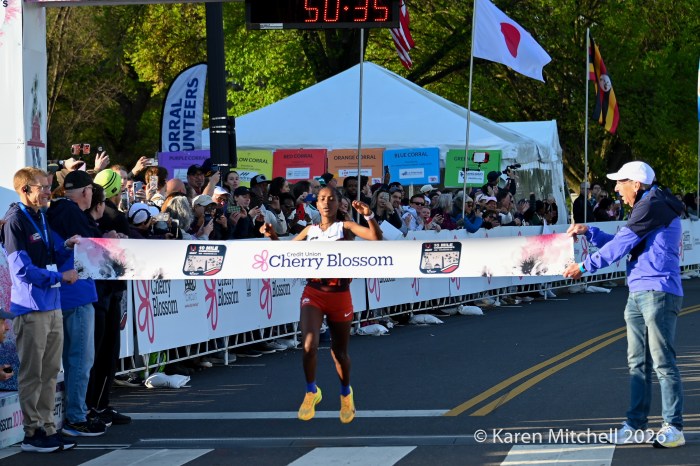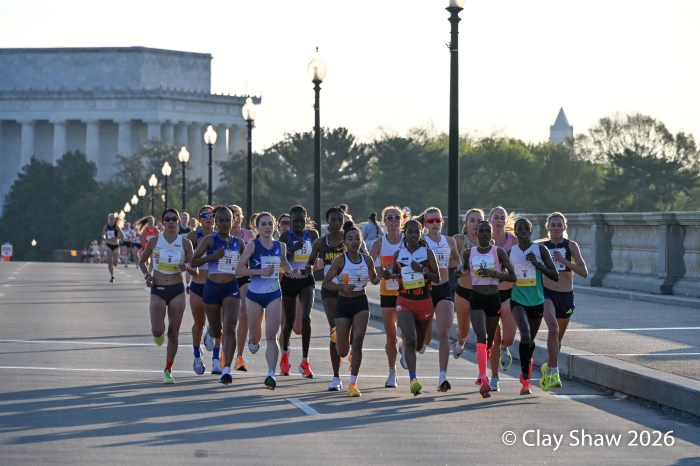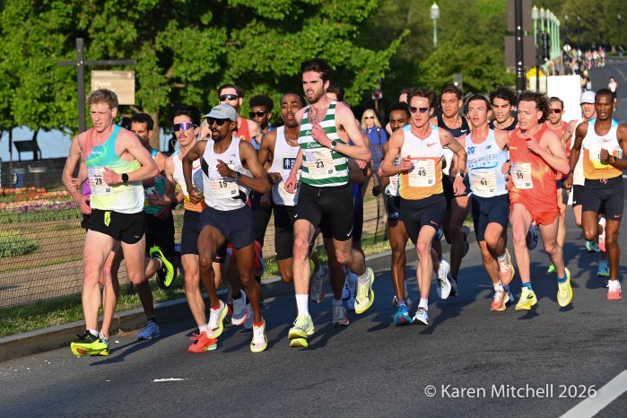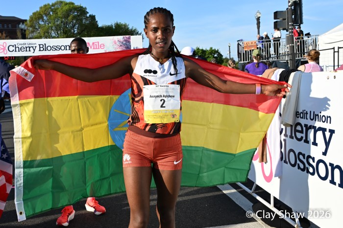 Washington, DC 4.12.26—Asayech Ayichew of Ethiopia had the best finish of a group of five at mile nine. The fourth place finisher at the World XC in Tallahassee ran the second fastest time ever at the Credit Union Cherry Blossom 10 Miler in 50:37. Joy Cheptoyek of Uganda, who earned a silver medal at the Tallahassee World XC was second in 50:41. Emma Grace Hurley of Indianapolis charged hard on the uphill final kilometer to earn the USATF 10 Mile Championship in 50:42. Weini Kelati of Flagstaff, AZ was fourth and second American in 50:46. Karissa Schweizer of Portland, OR was fifth and third American in her first 10 mile race ever, in 50:55. The top five women had formed a five-woman pack on the Hains Point section of the course. Earlier in the race, at least sixteen women were in the lead pack crossing into Virginia and back. It was a solid and large elite field, with over 20,000 finishers.