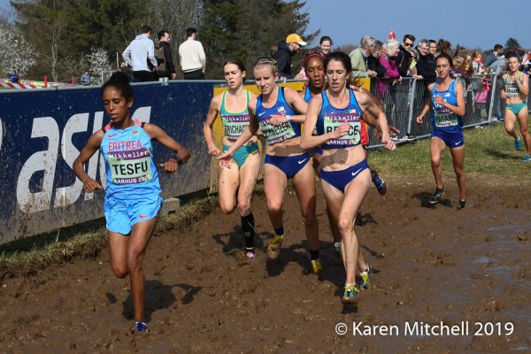 Stephanie Bruce of USA, a veteran of two World XC heads through the mud, just ahead of three USA teammates. Dolshi Tesfu of Eritrea, placed 38th, and Emily Brichacek of Australia, placed 35th.